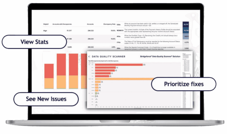 Bridgeforce Data Solutions, in partnership with Equifax, delivers industry-leading credit reporting compliance and disputes management solutions with seamless access to our Data Quality Scanner® and expert consulting. Trusted by more than 50 financial institutions, including top banks, credit unions, and fintech lenders, we help furnishers ensure data accuracy, prevent costly disputes, and mitigate regulatory risk with confidence.