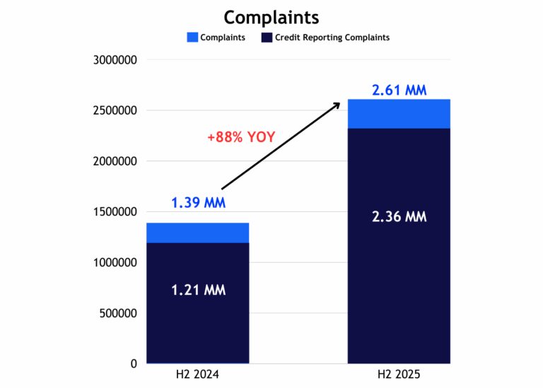 Consumer complaints filed through the CFPB Complaints Portal once again reached new highs in 2025, climbing from a little over 1.39 million in the second half of 2024 to 2.61 million in 2025 and marking an 88% increase year over year, with all signs pointing to continued growth.